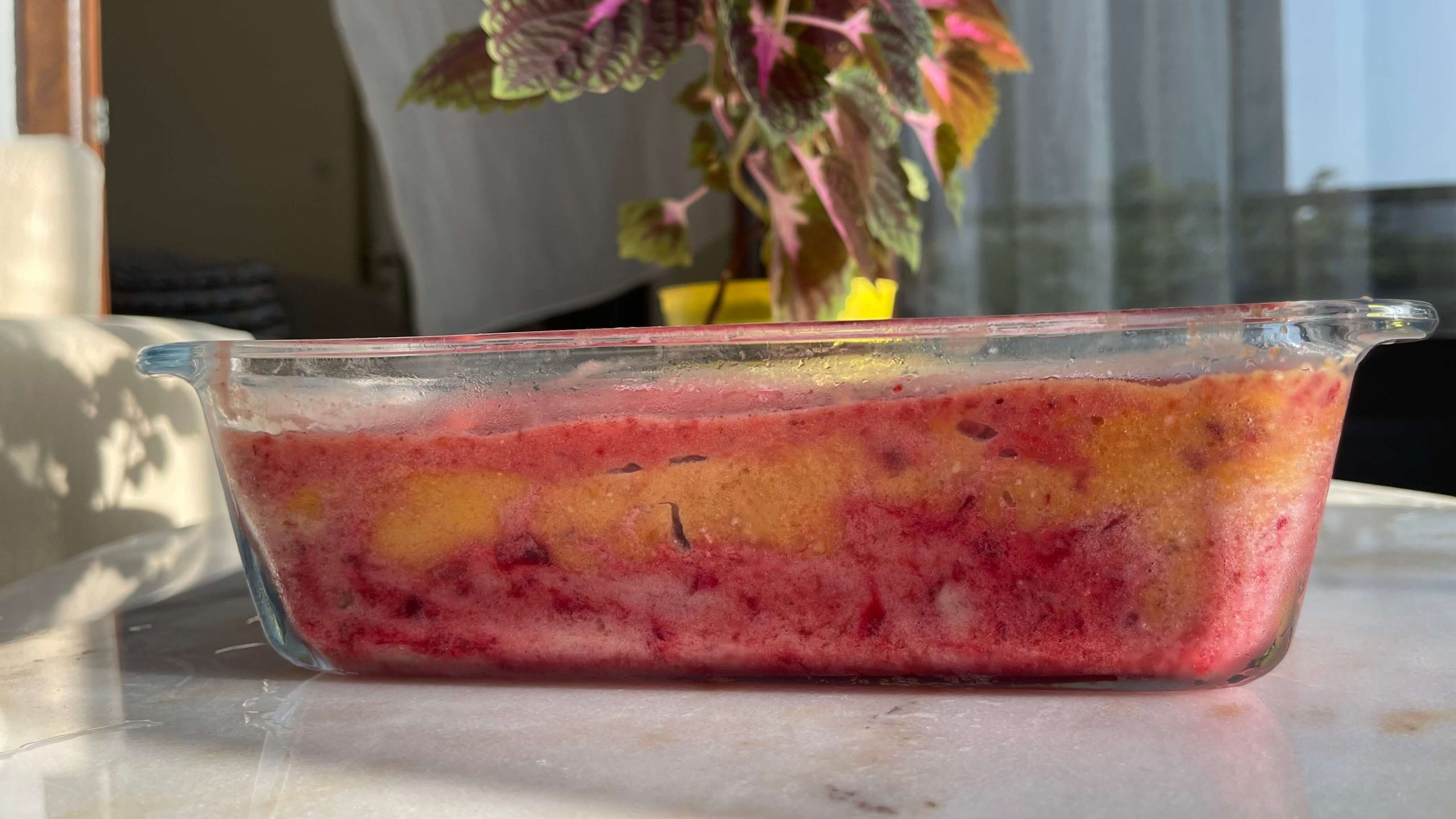 Sorbeleri, farklı renklerde üç kat olacak şekilde kek kalıbına yaydım ve 4 saat buzlukta beklettim. Buzluktan çıkardıktan sonra, kalıptan kolay çıkması için biraz oda sıcaklığında beklettim ve kenarlarından bıçak gezdirdim. Üzerine glutensiz bitter çikolata eritip gezdirdim.